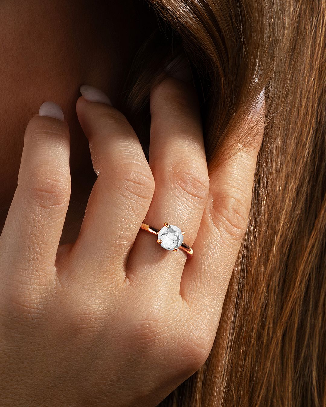 La bague Alcamia, ornée d'une somptueuse pierre en Howlite, est magnifiquement mise en valeur par une monture en acier rosé inoxydable, sertie de quatre griffes élégantes.