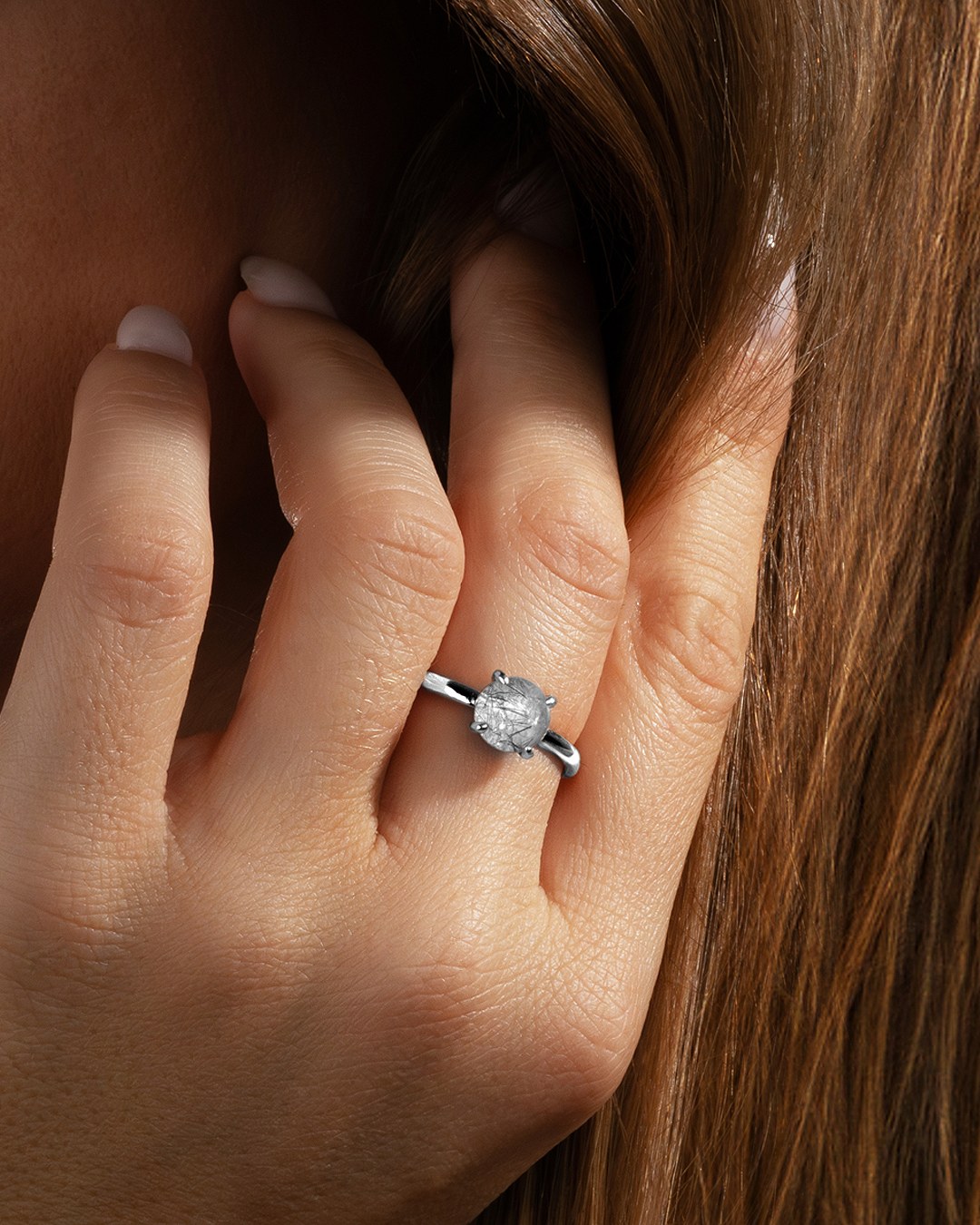 La bague Rimia, ornée d'une superbe pierre quartz rutile tourmaliné, est magnifiquement mise en valeur par une monture en acier argenté inoxydable, sertie de quatre griffes élégantes.