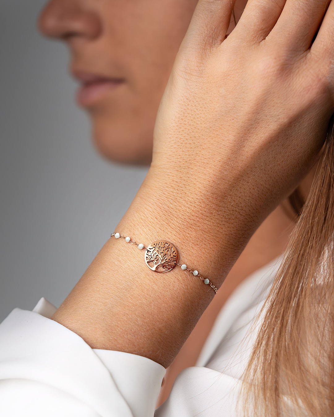 Le bracelet Alcato se caractérise par une chaine élégante ornée de six petites pierres facettés en howlite, mettant en valeur un arbre de vie en son centre.