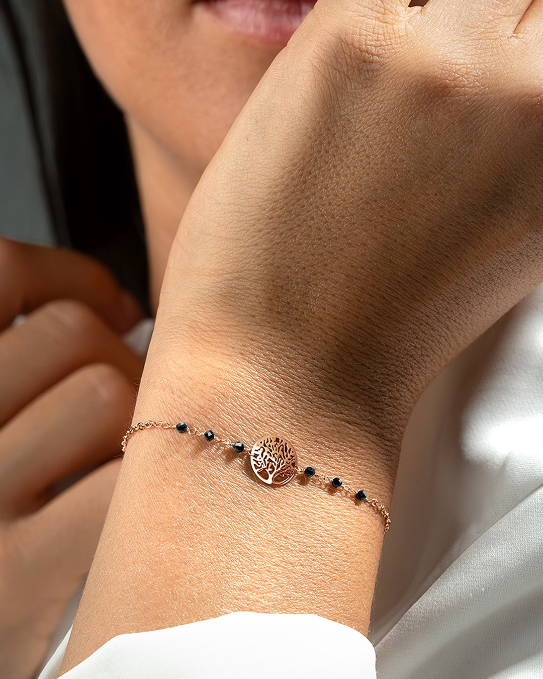 Le bracelet Leoneti se caractérise par une chaine élégante ornée de six petites pierres facettés en Tourmaline noire, mettant en valeur un arbre de vie en son centre.