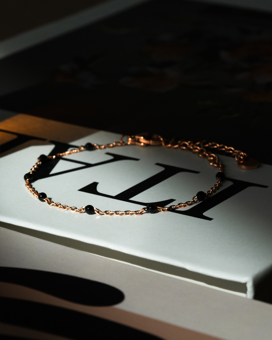 Le bracelet Livia Rosa est composé d'une chaine en acier rosé inoxydable, agrémenté de délicats ornements en émail noir.