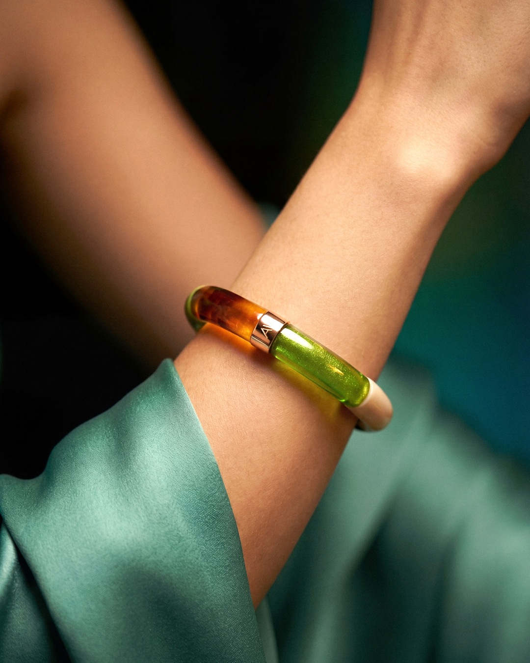 Laissez-vous séduire par ce bracelet en acétate artisanal, symbole d’un luxe accessible et d’une mode responsable.