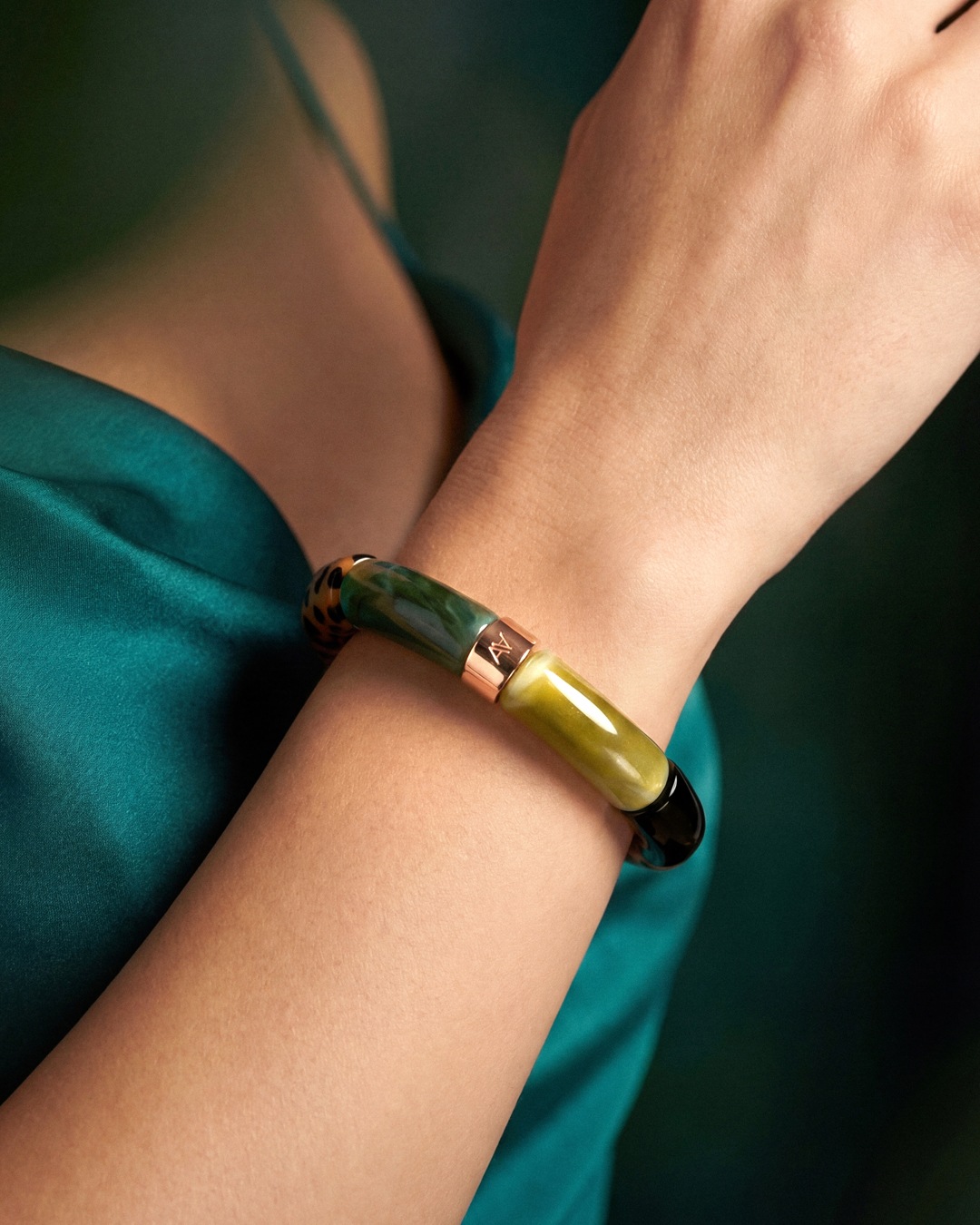 Laissez-vous séduire par ce bracelet en acétate artisanal, symbole d’un luxe accessible et d’une mode responsable.