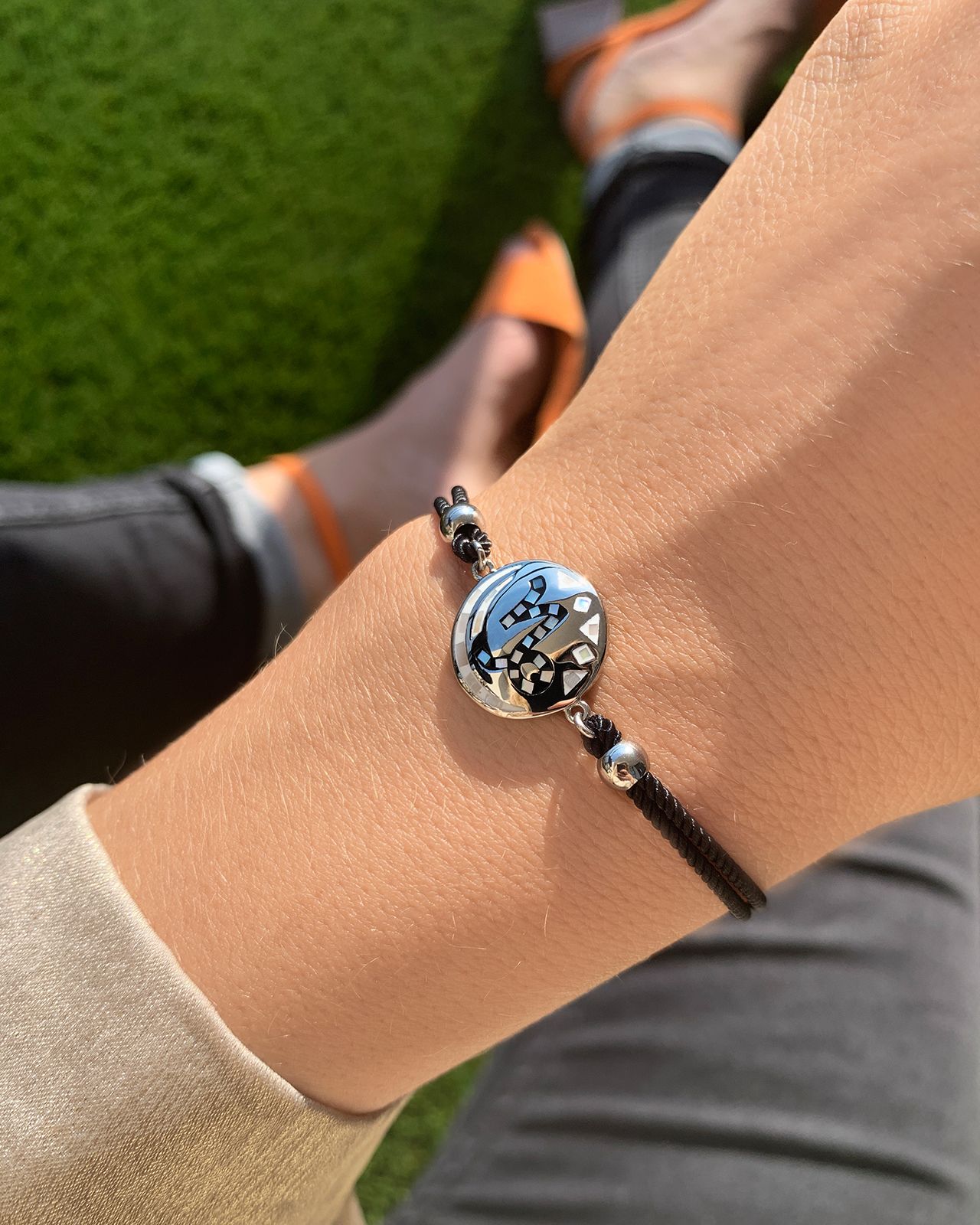 Le bracelet Capricorne est en acier émaillé serti de nacre.