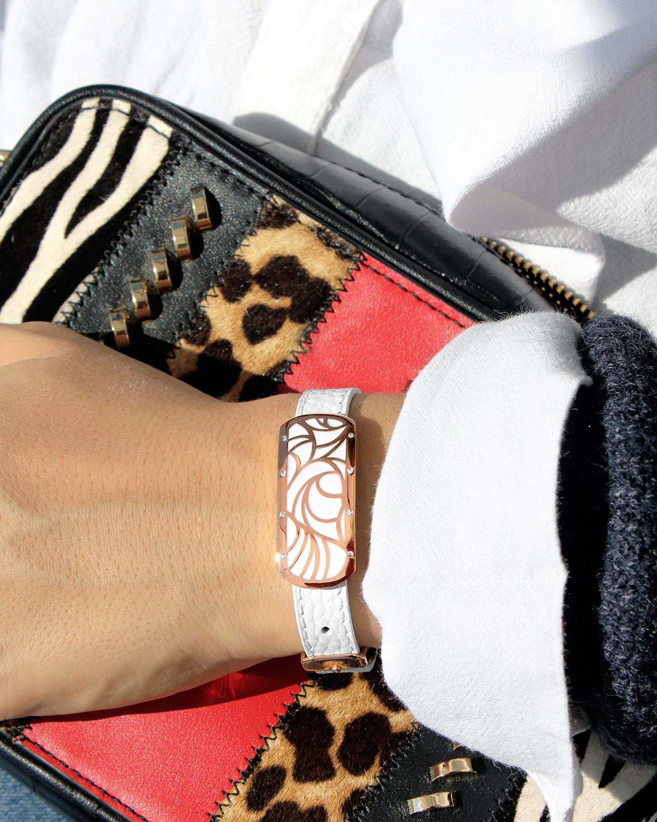 Le rosé de son acier et ses petits brillants subliment avec raffinement ce bijou tout en le rendant unique.