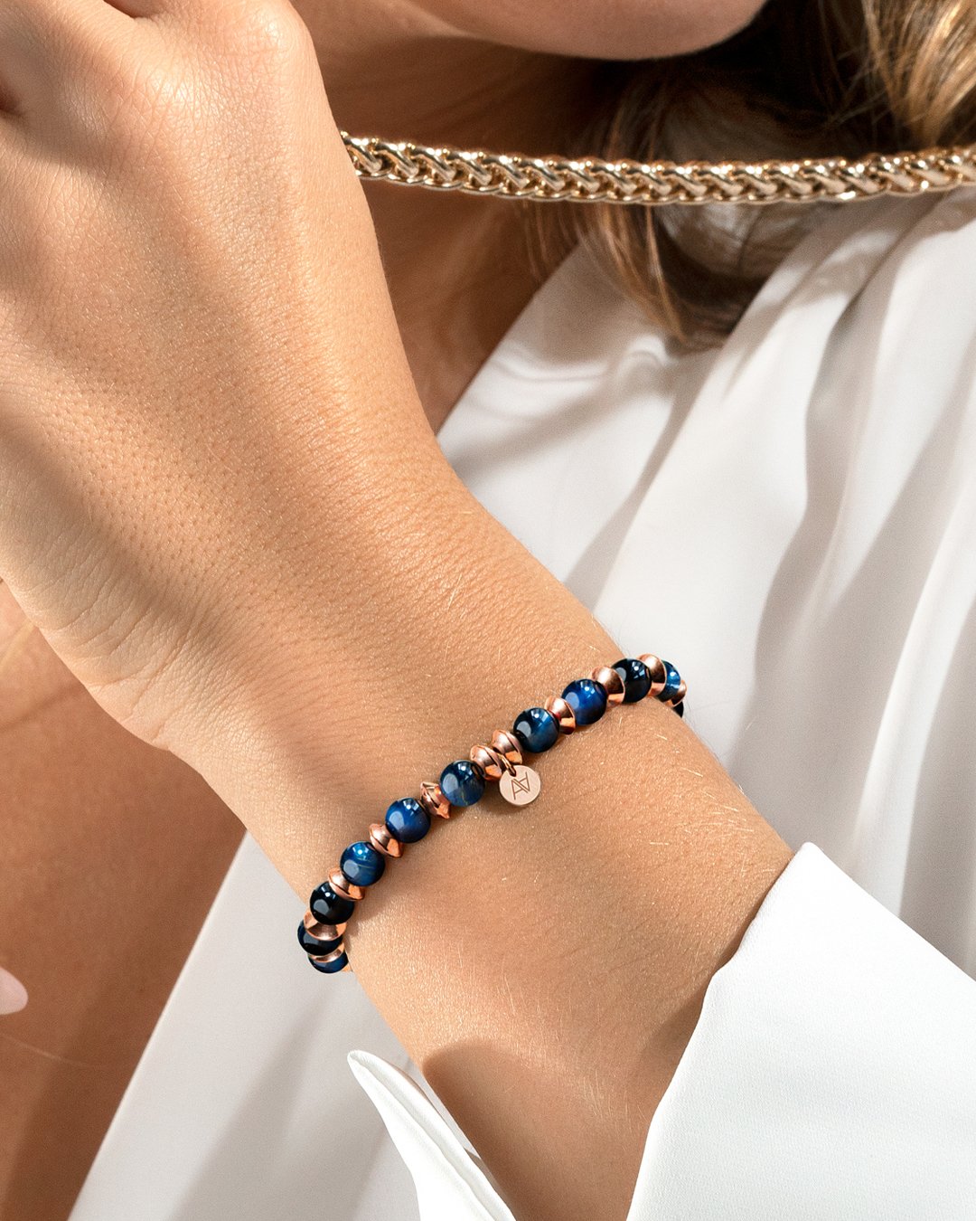 - Matière du bracelet Acier rosé inoxydable et oeil de tigre bleu