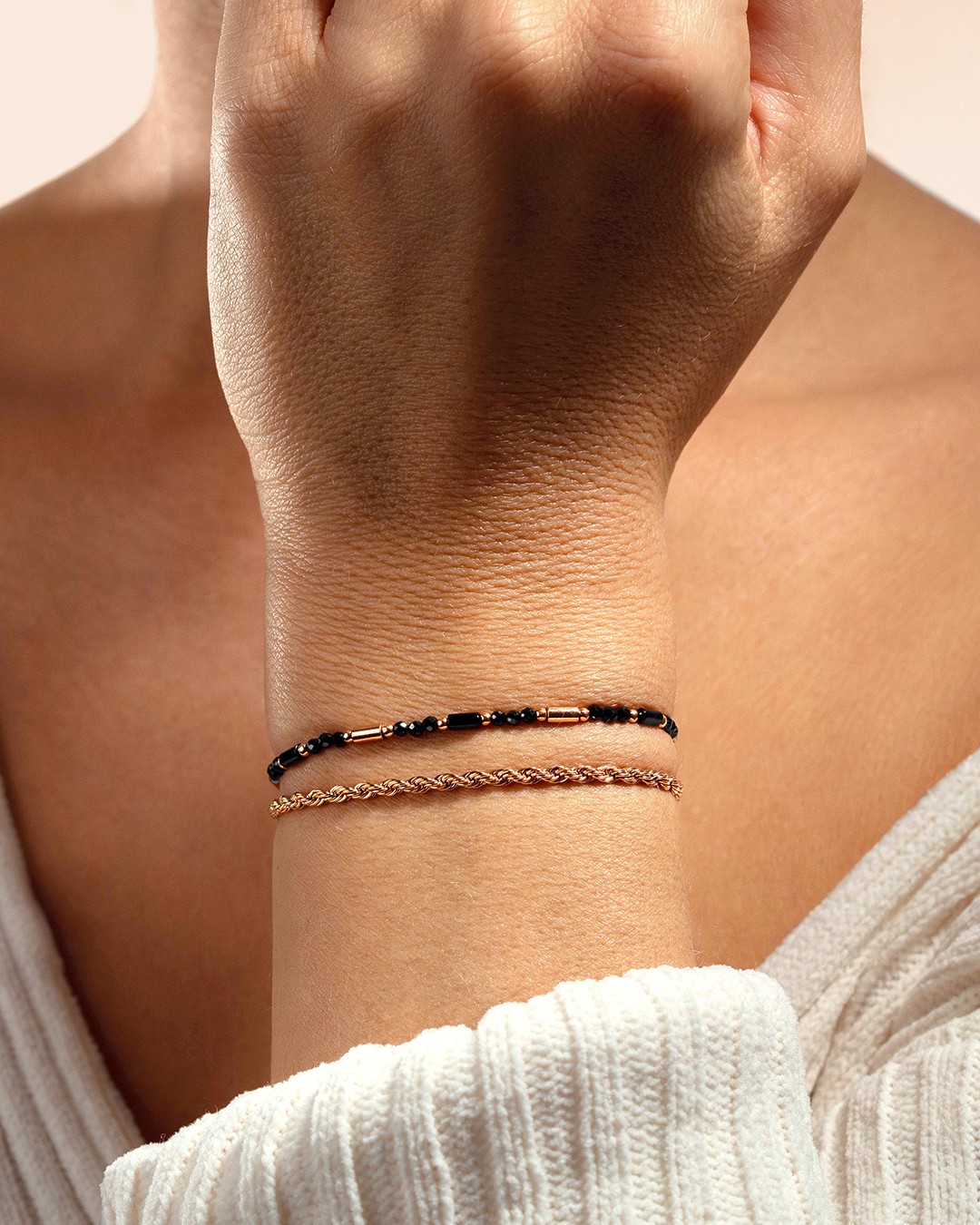 Le bracelet Portofina se compose de perles facettées de Tourmaline Noire, connue pour ses vertus protectrices et d’ancrage, et de tubes en Agate Noire, pierre réputée pour apporter force et stabilité intérieure.