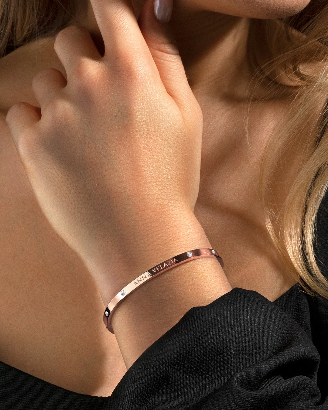 Le bracelet Stella Rosa, fait d'acier rosé inoxydable et parsemé d'oxydes de zirconium, est aussi délicatement gravé de notre marque sur la plaque extérieure.
