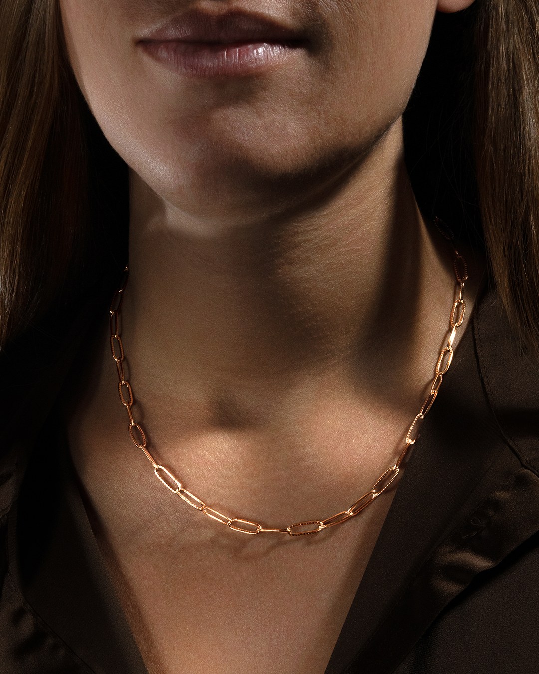 Le collier Gaïana Rosa est composé d'une chaine, ornée de délicats maillons martelés, en acier rosé inoxydable.