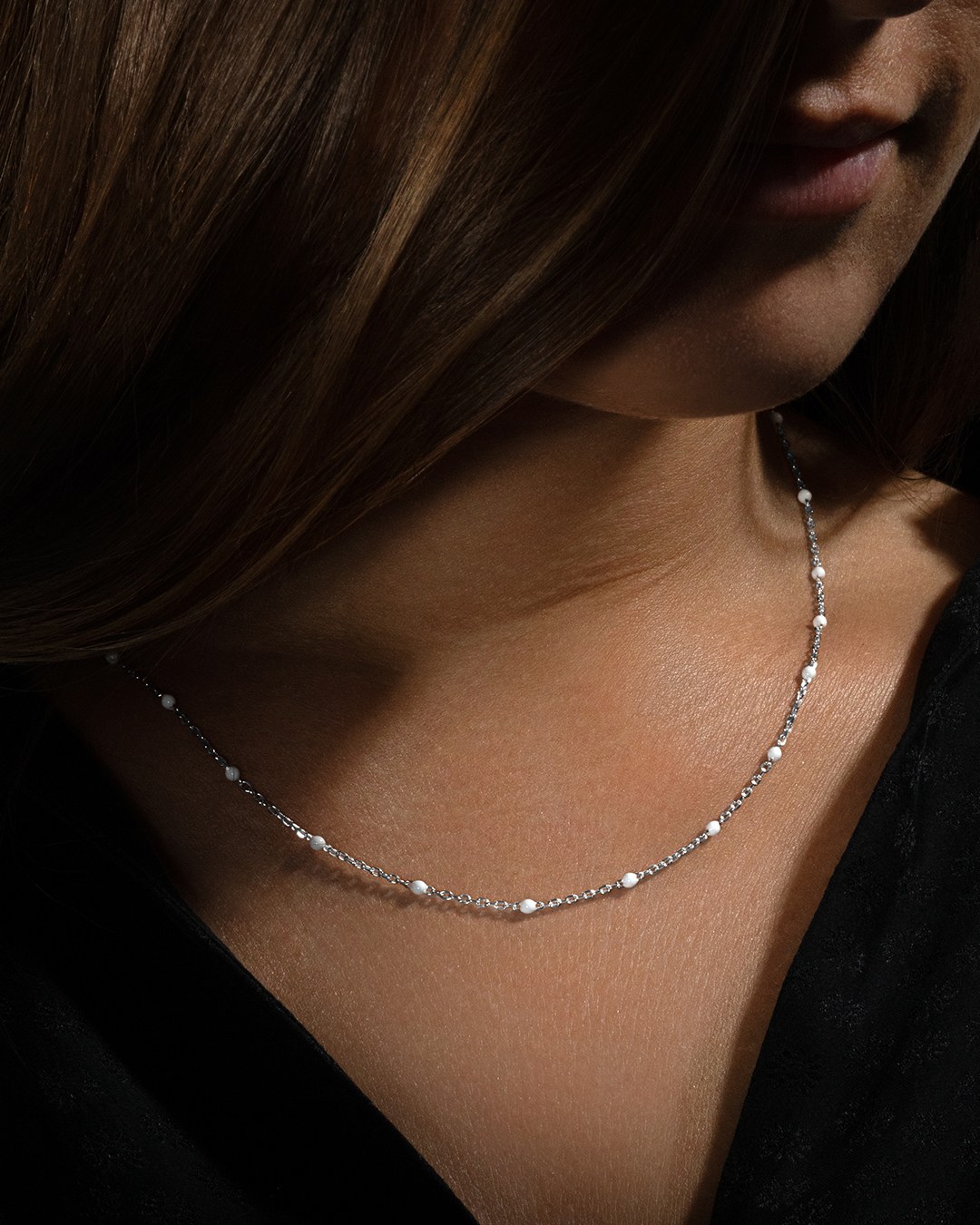 Le collier Lenaya est composé d'une chaine en acier argenté inoxydable, agrémenté de délicats ornements en émail blanc.