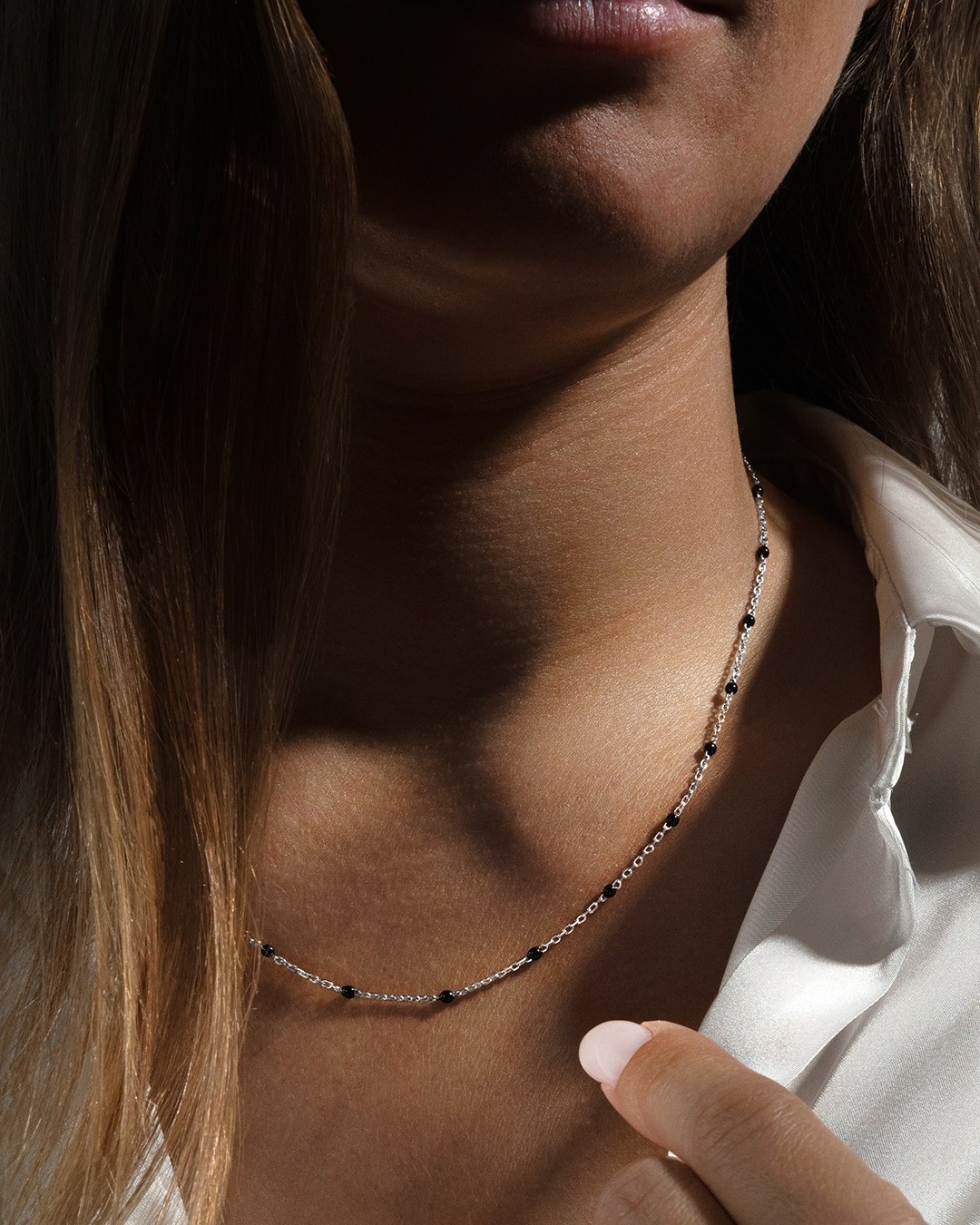 Le collier Liviana est composé d'une chaine en acier argenté inoxydable, agrementé de délicats ornements en émail noir.