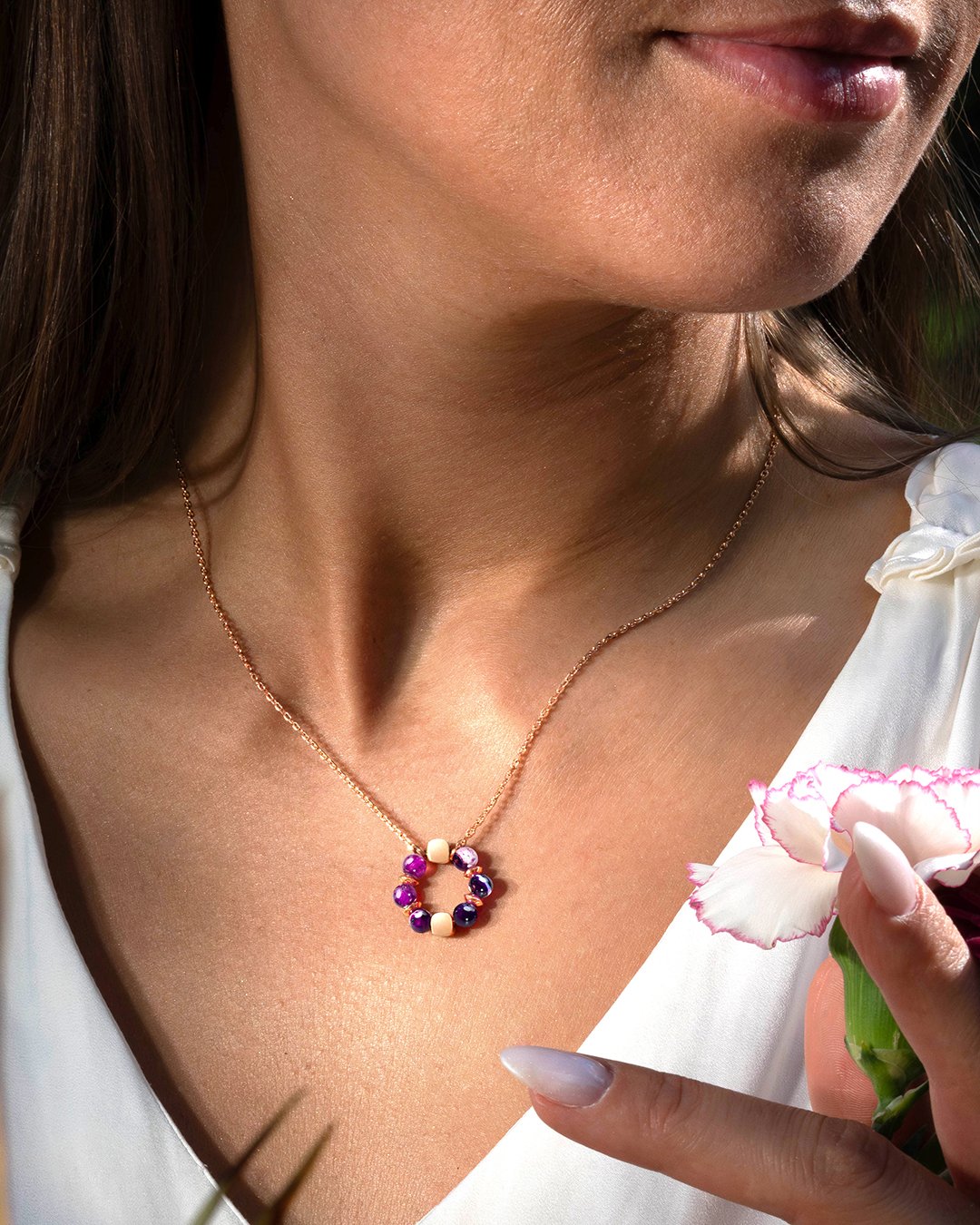 Le collier Porporia dévoile un pendentif raffiné en forme de fleur, entièrement façonné à partir de pierres en Agate violette.