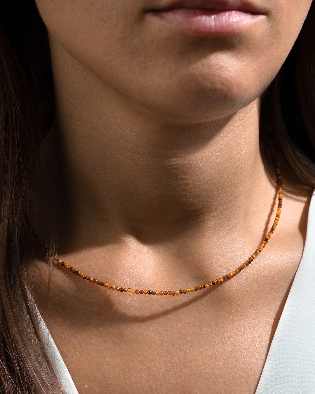 Le collier Messi met en valeur un délicat ras de cou composé de fines pierres facettées en œil de tigre de 2 mm.