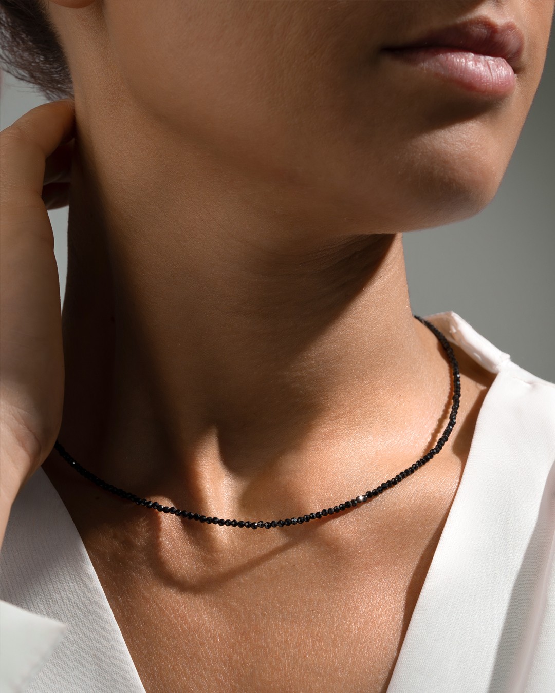 Le collier Leona met en valeur un délicat ras de cou composé de fines pierres facettées en tourmaline noire de 2 mm.